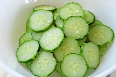 - Thinly slice the cucumber (1/8 to 1/4-inch thick).